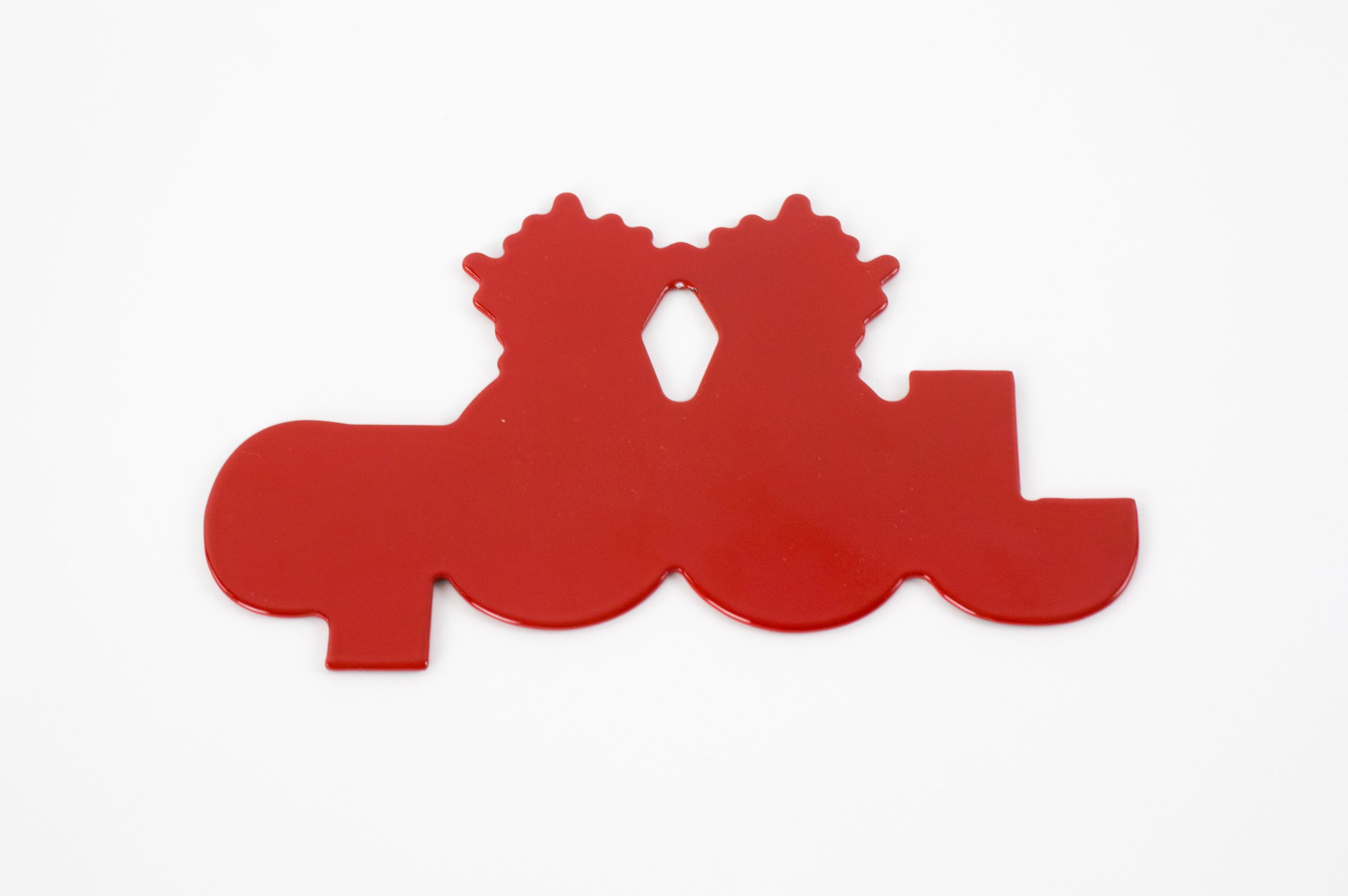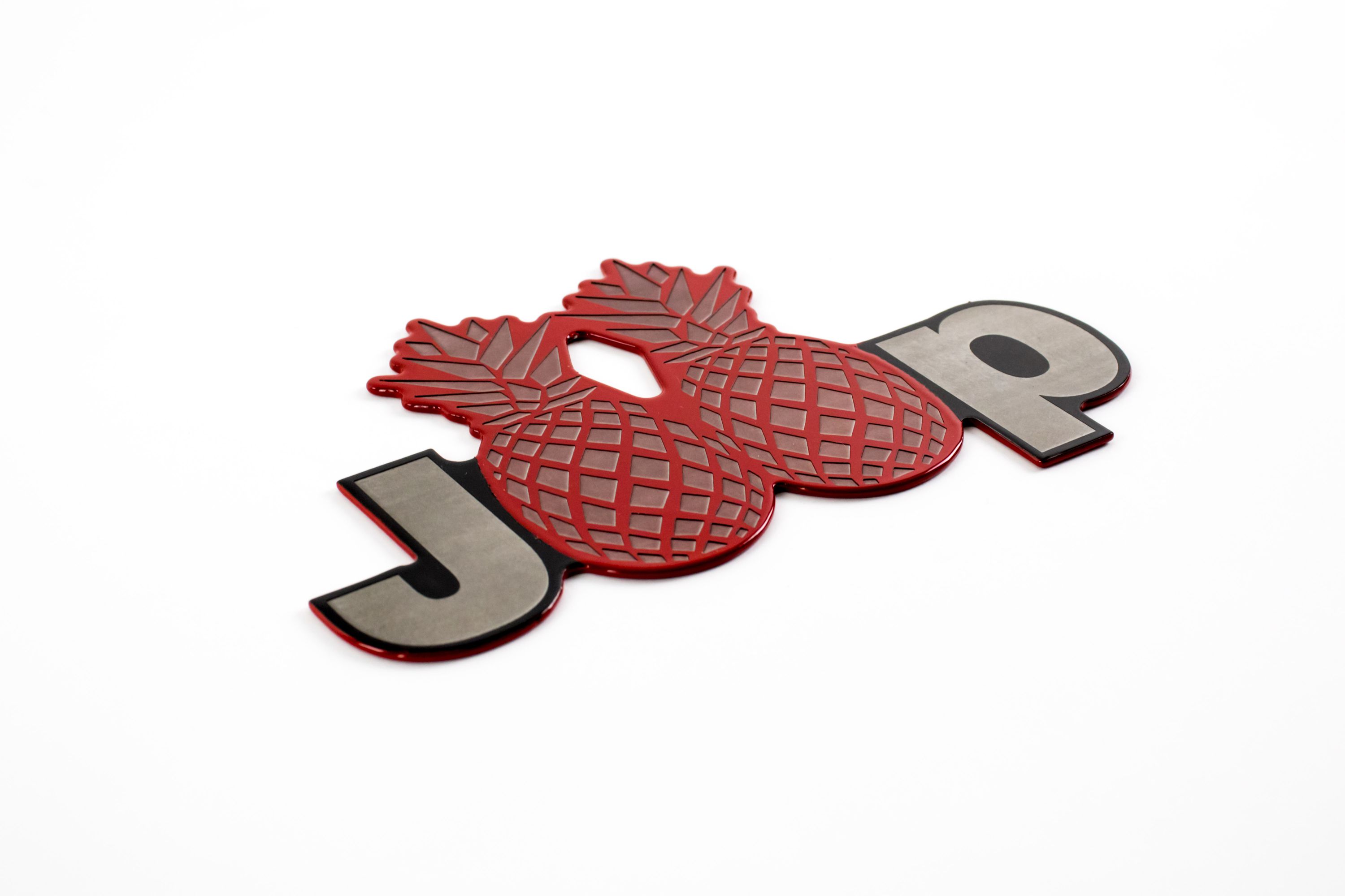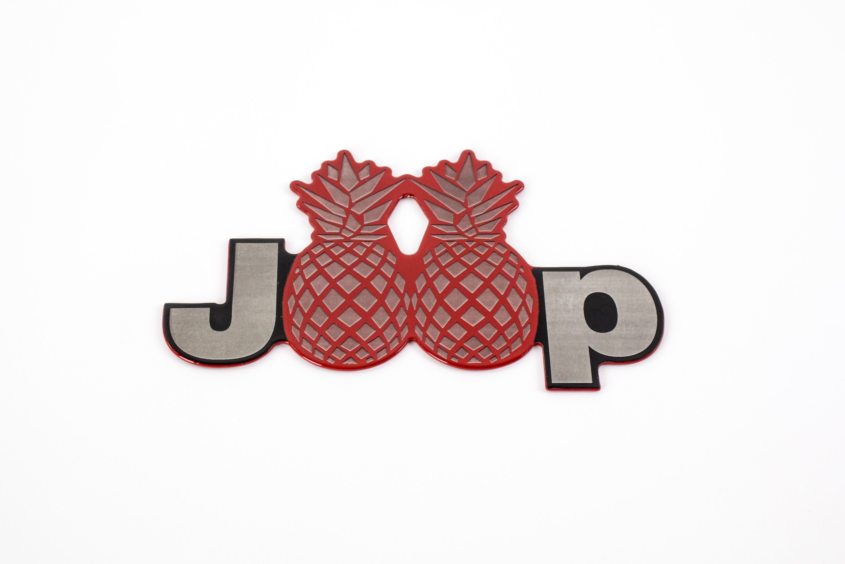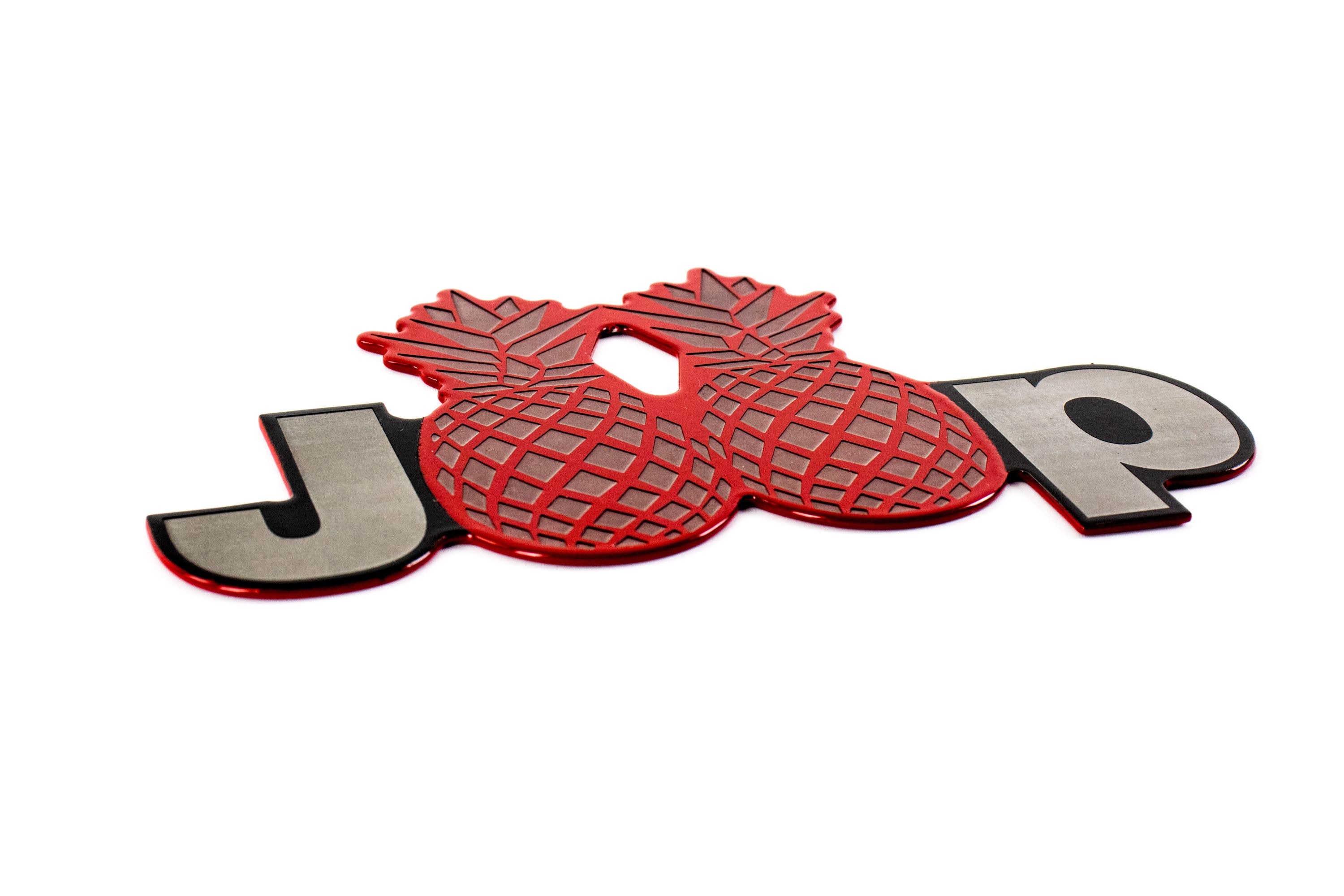 The Jeep logo was a custom engraving project for one of our customers. We started off by cutting the logo out of aluminum, prepped it by washing it with iron phosphate, and applying a base coat of 90% gloss black. After the pieces had been in the oven for approximately 15-20 minutes, we took them out and let them cool. Once cool, we masked J and P, and hung them for the second coat of 90% gloss red. Once out of the oven, we pulled the high temperature tape and revealed the two tone Jeep logo.